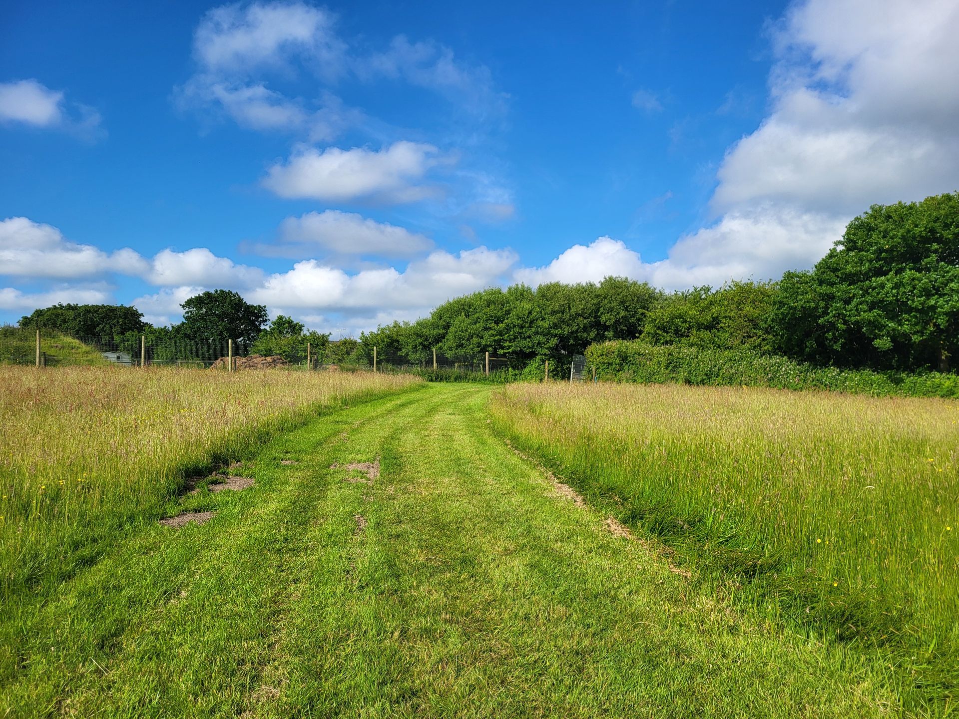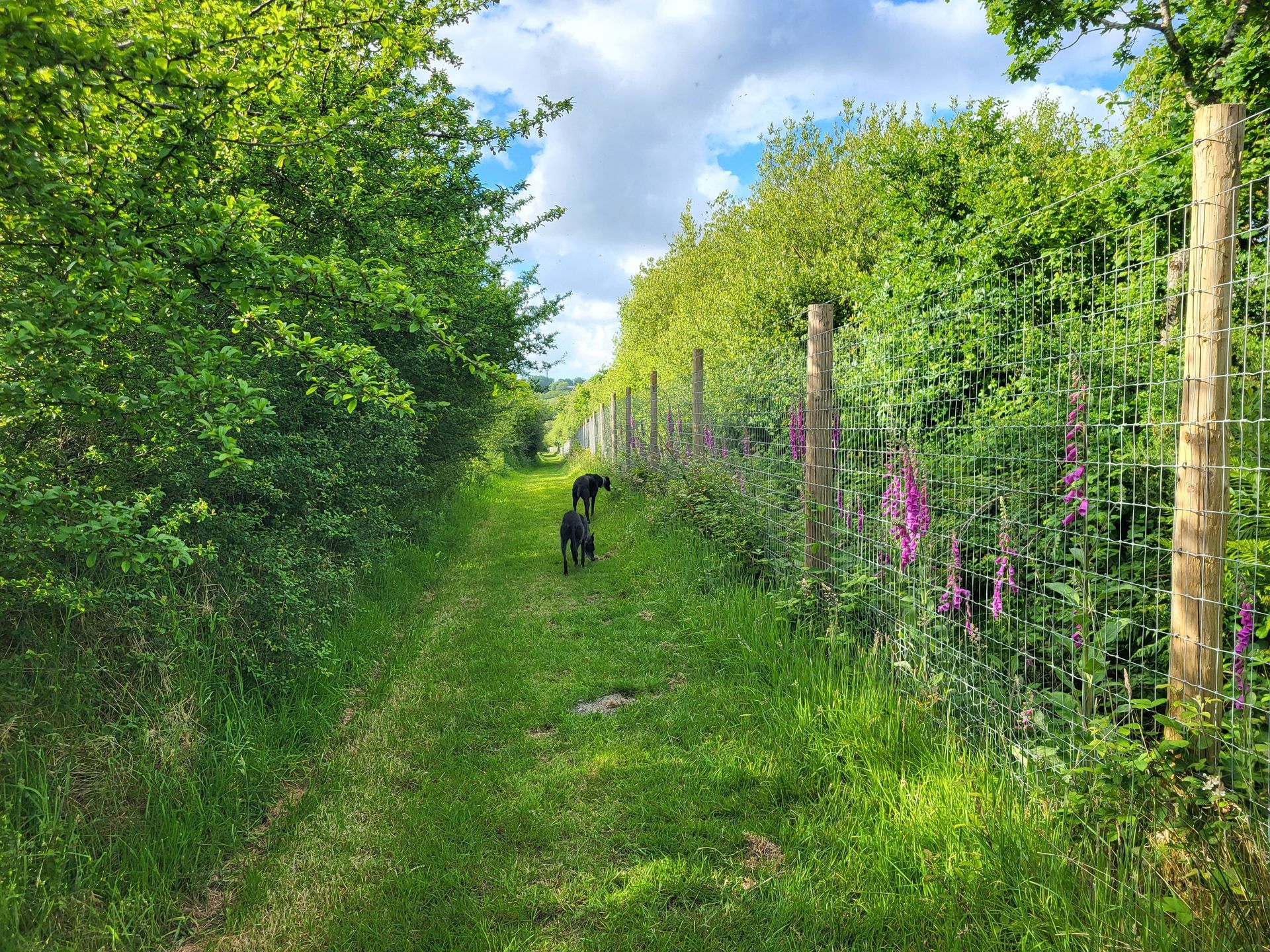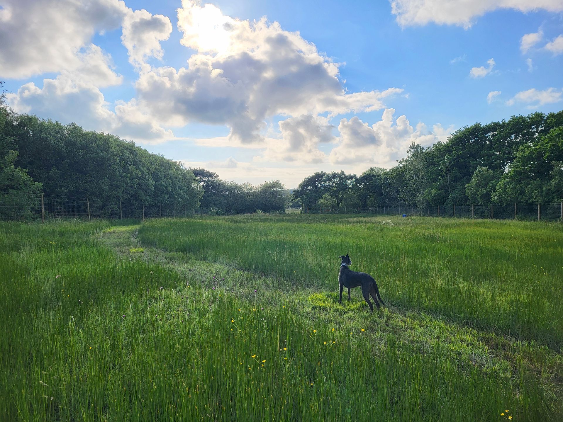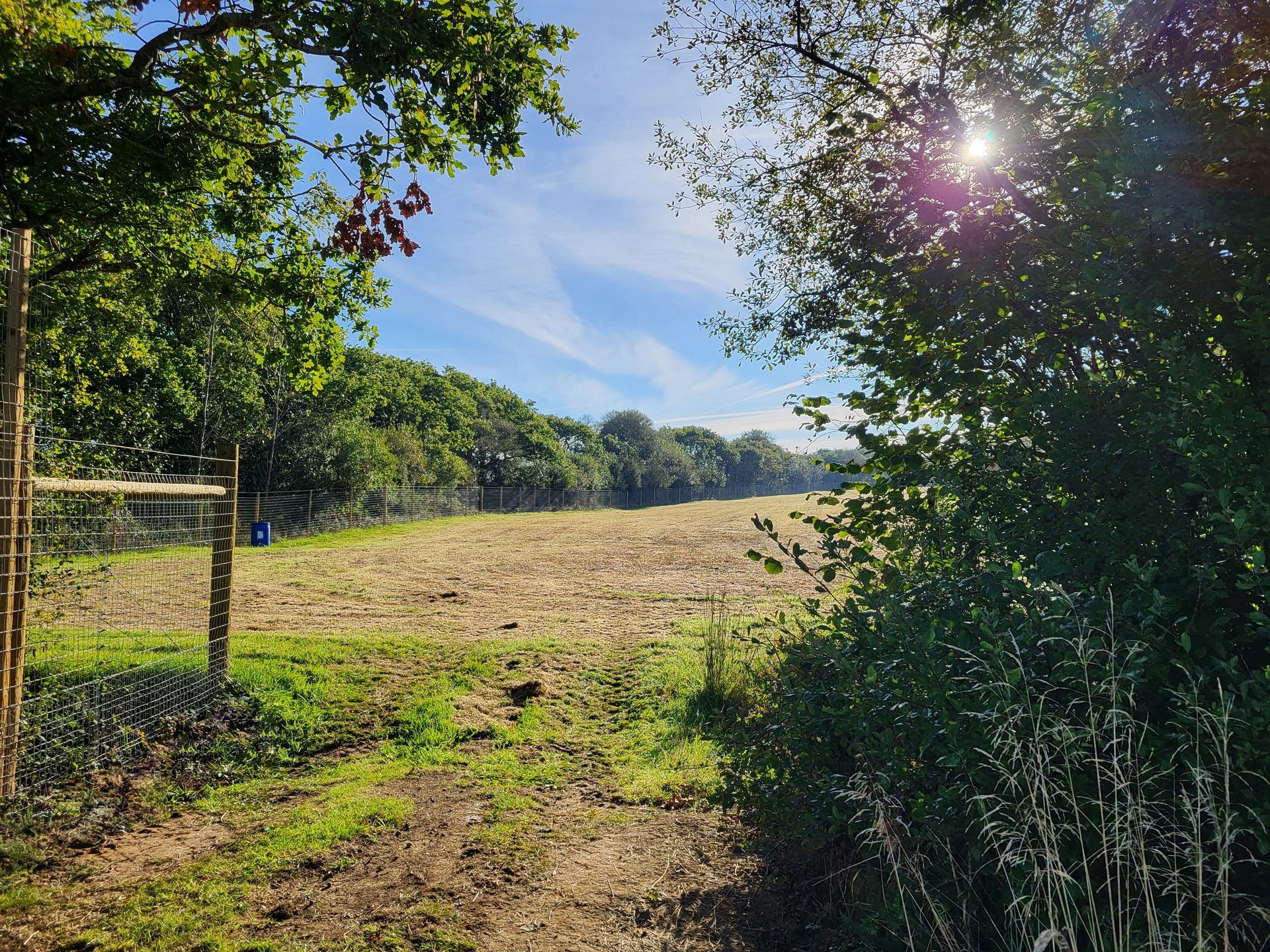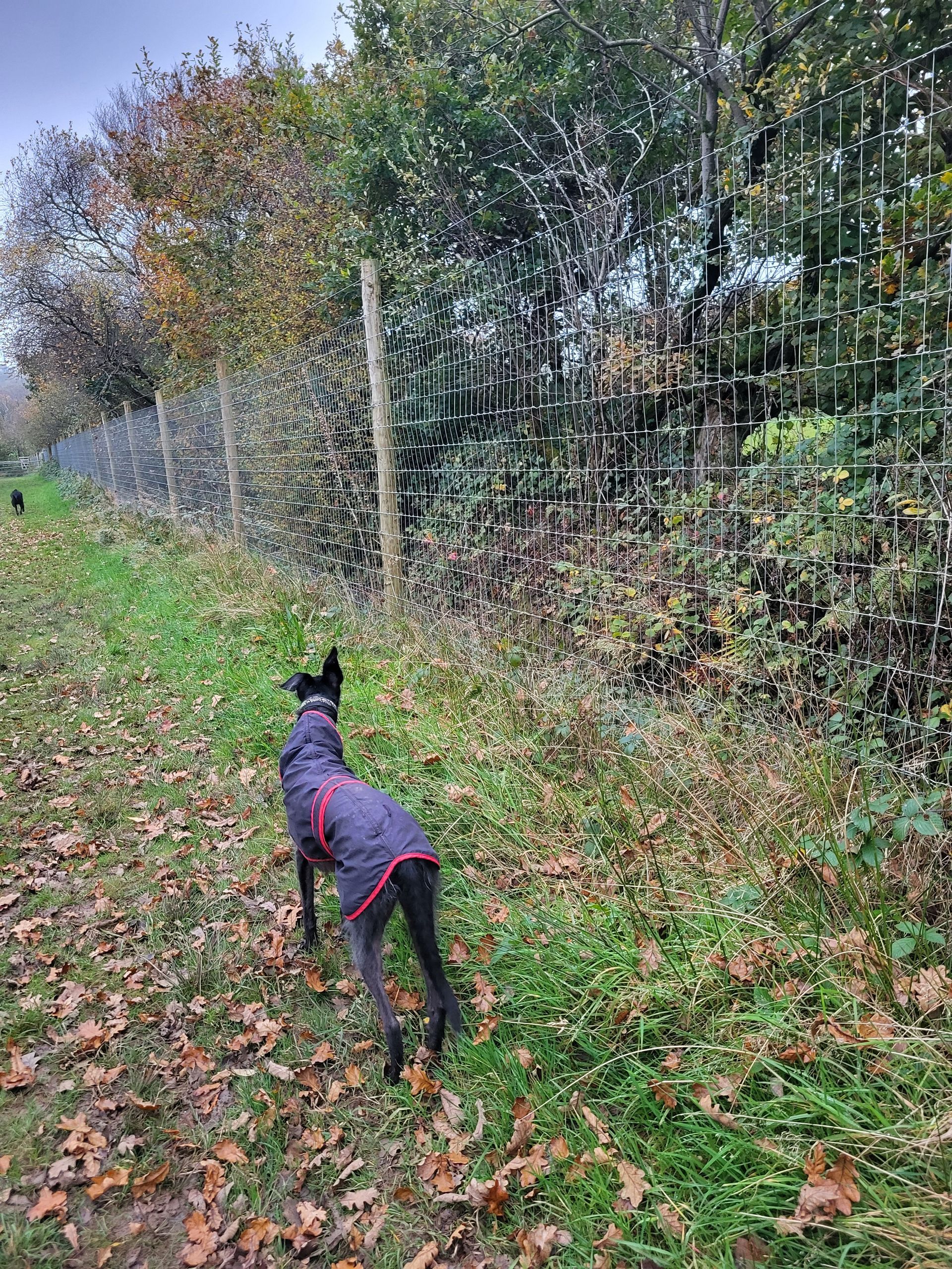 The perimeter is enclosed by Tornado Dog Fencing: 6ft, small hole/high tensile wire, most of which also has an additional top wire making it over 6ft high. The internal area is subdivided into smaller fenced/gated sections so you can keep track of your dogs, with the fenced woodland located in the centre. A small section to the side of one track has dense hedgerow and trees, the fencing in this section is 5.2ft however it has hedge/trees directly behind it creating a 10ft + 'wall'. Visiting owners, even with the most reactive or flight risk dogs, have never found this to be an issue, so unless your dog is likely to jump head first into a tree then this should not pose an problem.